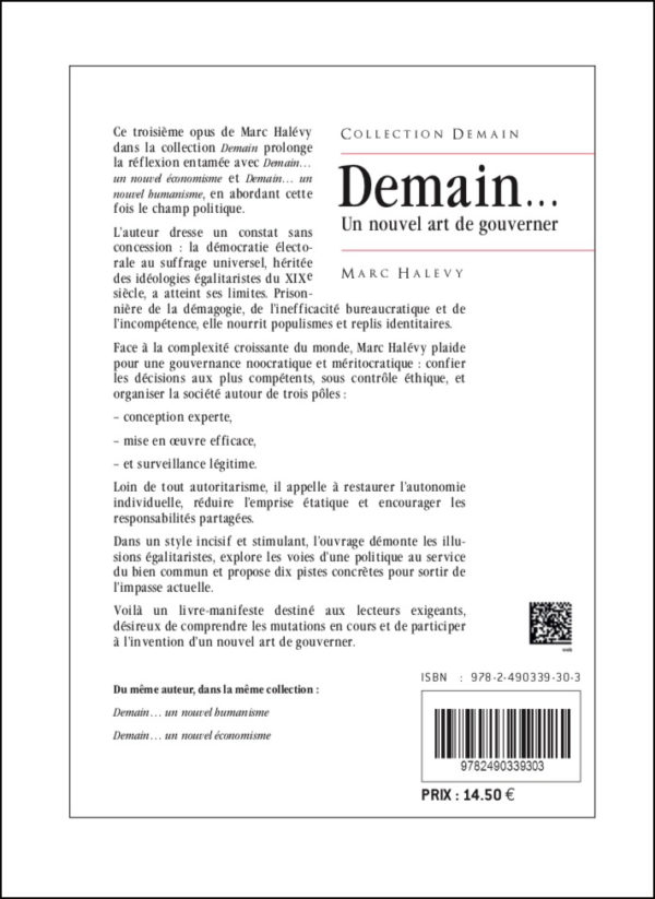 Ce troisième opus de Marc Halévy dans la collection Demain prolonge la réflexion entamée avec Demain… un nouvel économisme et Demain… un nouvel humanisme, en abordant cette fois le champ politique.